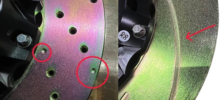 Sprickbildningsrisk och hållbarhet En nackdel med borrade skivor är att hålen skapar svaga punkter i bromsskivan. Detta kan leda till sprickbildning vid hög belastning, speciellt vid snabba temperaturväxlingar, till exempel från hög värme till en snabbt kyld skiva. Det är viktigt att värma upp bromsarna innan intensiv användning och låta dem kylas ned gradvis för att minimera sprickrisken.