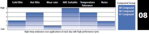 is one of PFC’s newest and has gained immediate favour in extended Endurance Sportscar, and GT racing due to its performance in applications where smooth initial bite is a must. 08 has a slight friction rise with temperature, excellent release and modulation characteristics. Very low disc wear, similar to 01. Despite its considerable performance, 08 has the lowest wear rate of all PFC compounds and can easily match the wear characteristics of the other competitor’s materials but with much higher bite.