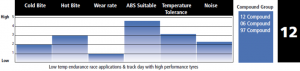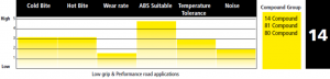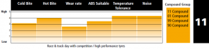 Lower friction and slightly less bite than the more aggressive PFC compounds. Higher thermal stability. For low grip applications and road tyres.