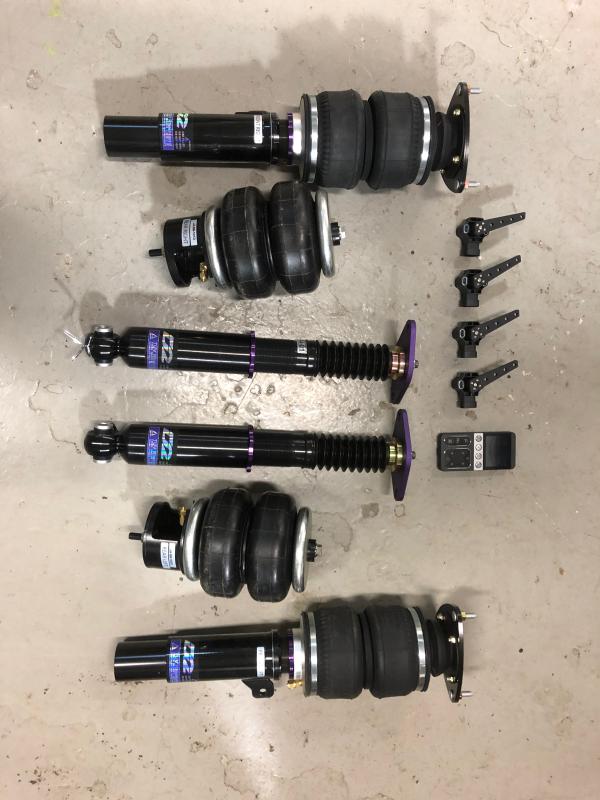 A very advanced air kit where you get D2's super fine dampers and with recognized high quality. A real control system with four programmable heights that the computer remembers and you store with simple button presses. You can control all four dampers completely individually. The system is read via potentiometers that you mount between the support arm and the body (similar to a xenon level sensor). This requires a very careful installation, good mechanical skills are a must. When these are installed, you have automatic level regulation. The mode you have programmed in will keep the car regardless and you load the car full of buddies or beer ;-)