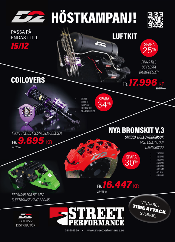 Under denna Höstkampanj är priserna kraftigt reducerade på våra coilovers, bromskit och luftkit ifrån D2.