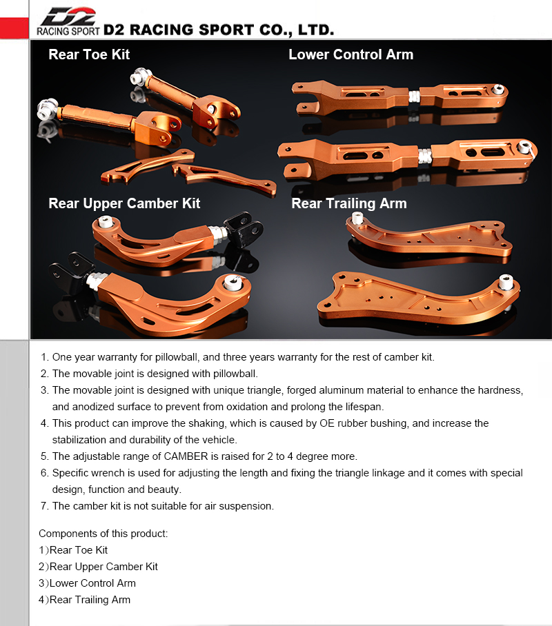 1)      Rear Upper Camber Kit   2)      Rear Toe Kit   3)      Lower Control Arm    4)      Rear Trailing Arm