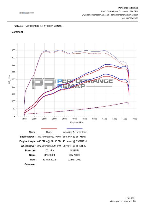 Under den sista prototyptestningen fann vi att kitet gav en ökning på i genomsnitt 5,5BHP. Men när den är ihopkopplad med vår turboinloppsadapter FMTIA5/9 var det här EA888-motorn såg imponerande ökningar, vilket ökade effekten upp till 16BHP vid 6500RPM med en signifikant genomsnittlig effektökning från 4500RPM till 6700RPM Rev-gränsen på 10BHP, medan körbarheten och kraften från extra vridmomentökningar kan kännas på vägen eftersom mellan 4000 RPM till varvtalsgränsen uppnås en genomsnittlig vinst på 20NM. Värt att komma ihåg att detta är standard ECU och mapp, med en optimerad motor får du mer nytta av denna uppgradering.