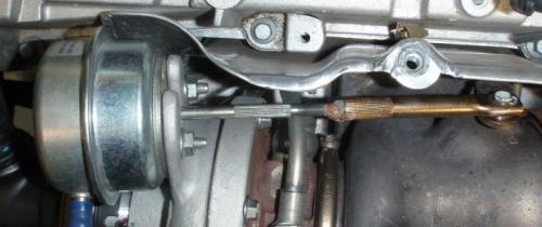 Garrett-turbons standardwastegate (monterad) - monteringsfästet är fastsatt på turbons hus.