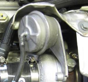 IHI-turbons standardwastegate - monteringsfästet är fastsatt på wastegatens kropp.